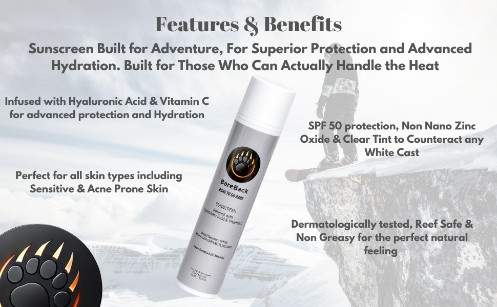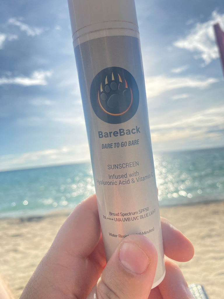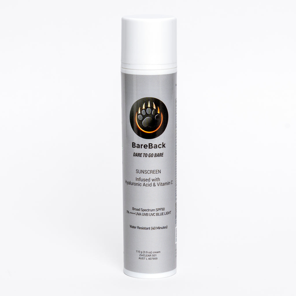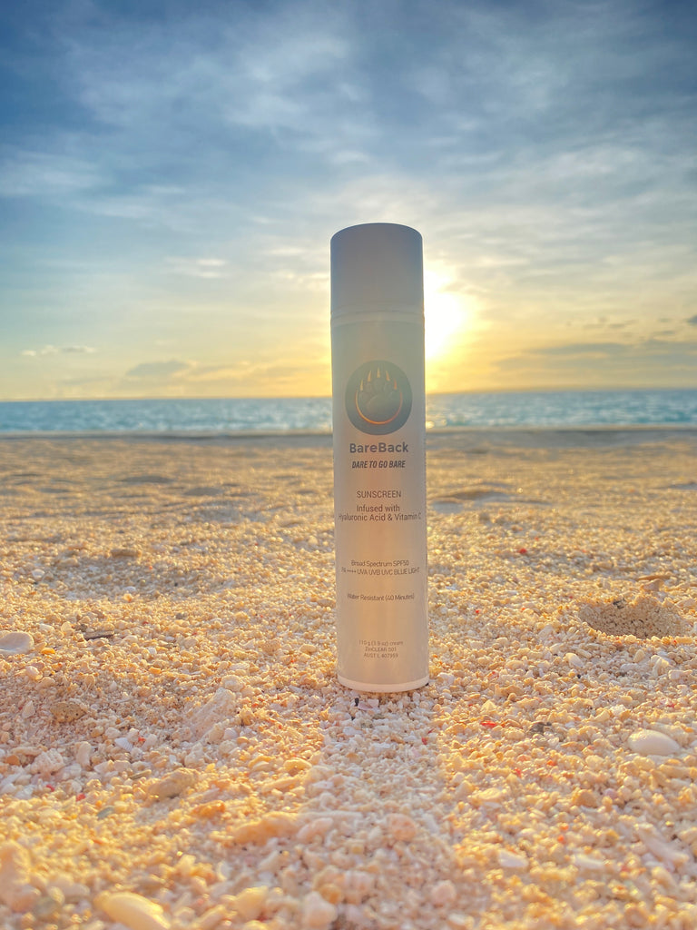 Bareback's All Natural Mineral Sunscreen, made with Non-Nano Zinc Oxide and Infused with Hyaluronic Acid & Vitamin C provides the perfect blend for superior protection and Hydration. Providing SPF50+ Broad Spectrum protection, reef-safe and safe for all skin types